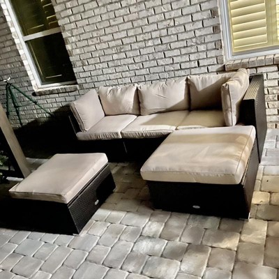 This patio furniture set is fantastic! The five pieces fit together perfectly to create a cozy and stylish seating area for my outdoor space. The cushions are confortable and the ottoman table is a great addition for convenience. The rattan material is high-quality and has held up well to both sun and rain. I highly recommend this set to anyone looking for comfortable and durable outdoor furniture