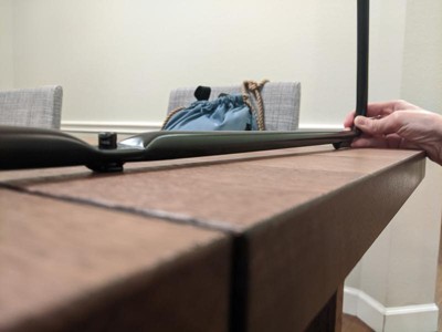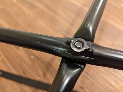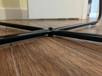 [This review was collected as part of a promotion.] Super easy to assemble but the center piece and screw scratches the floor. I don't know if the piece came in damaged or if it was soldered the wrong way but the point there the feet cross it's lower (closer to the floor) that the corners where the actual feet are located.