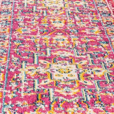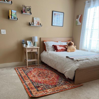 This rug's bright colors and vintage pattern add a Bohemian touch to your modern loft, Boho bedroom or colorful cottage. With its kid-friendly busy pattern, this rug is ideal for a kitchen, living room, den, bedroom or entry. An orange background, geometric central medallion, and bold color accents give this rug funky style.
