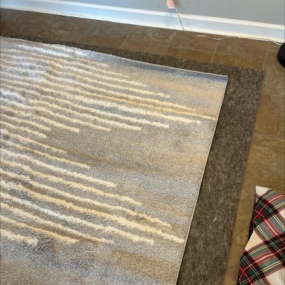 Nice, sturdy backing, but will need a rug pad underneath. Fluffs up nicely, and it's soft (my cat was immediately obsessed). Strong smell on opening, and it's been airing out in the spare room for a few days with no sign of relief. Stripes are more like a charcoal grey than black, but that's what I wanted.