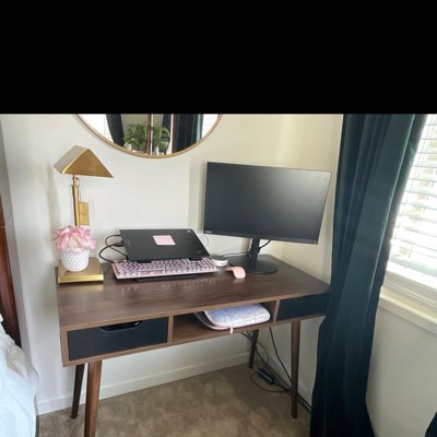 It is a very beautiful functional desk that is heavy and sturdy. The drawers roll in and out nicely and I like the mid century modern style