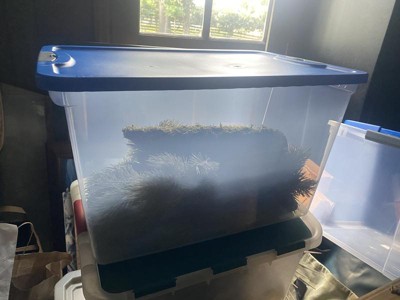 [This review was collected as part of a promotion.] I got these two 64 quart secure latching large clear plastic tote storage bins with they are absolutely amazing they're sturdy they don't fall apart like most of the regular totes that you buy, the brand is Homz and they are 64 quart tote so they're pretty big and very very sturdy you can use them for packing up linens or towels or even storing clothes or toys they're just the perfect tote and they have lids and they're clear so you can see what's in them instead of having to tear through everything or open every tote up. I highly recommend them