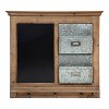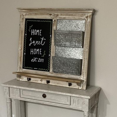 - Decorative wall mounted organizer with chalkboard, two galvanized metal file pockets and three lower metal hooks