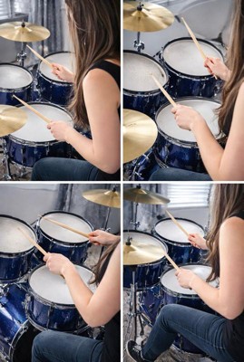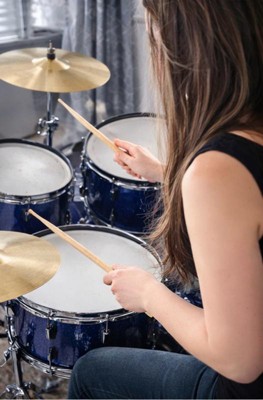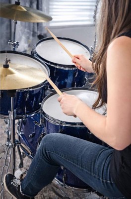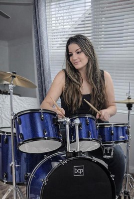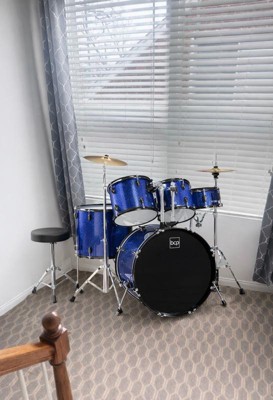 [This review was collected as part of a promotion.] This drum set looks so good in person. I love the blue sparkle finish which really stands out. I placed the drum set at the base of my basement stairs and is the perfect setting for it. My husband loves it and he even let me play it for the photos. He says is the perfect start up set of drums and he loves it. It plays a good tune and the cymbal is so strong. Love it because is very durable and not matter how much I hit it with the sticks.