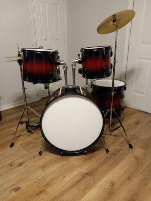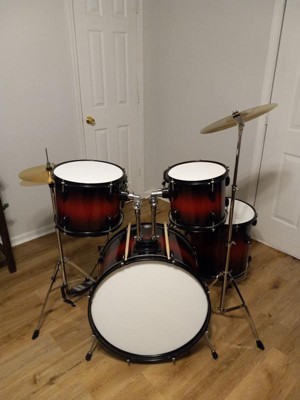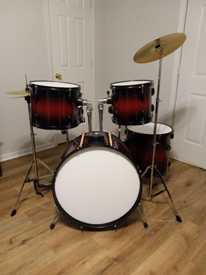 [This review was collected as part of a promotion.] My son loves his new drum set it's so gorgeous we love the red and black colors this is a full size drum set complete with every piece needed to play this set includes a snare, band drum, floor Tom, high hat cymbal, ride symbol, bass drum pedal, stool, 2 rack Tom's and drumsticks it was very easy to assemble took a couple hours if that these drums have a wood shell easy to customize perfect for beginners and experienced drummers the finish is high gloss white drum heads and silver hardware we could not wait to get it finished it's now in his room and I look forward to seeing his drum skills grow