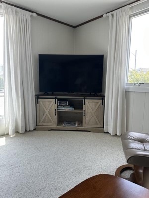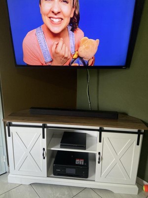 Make your farmhouse fantasy a reality with Saracina Home’s Robinson Rustic Farmhouse Sliding Barn Door 52” Corner TV Stand. You can practically feel the countryside breeze as you admire the exposed black metal hardware and X-front sliding barn doors. With three cord management ports and three adjustable shelves, this beautiful unit also boasts ample organization for all your movies, tech, and games. The two sliding doors are sized to perfectly conceal the left and right compartments, giving you neat, easy- access closed storage. And you can still achieve your dream cozy aesthetic even in tight quarters, because this entertainment center is designed to fit perfectly in corners.
