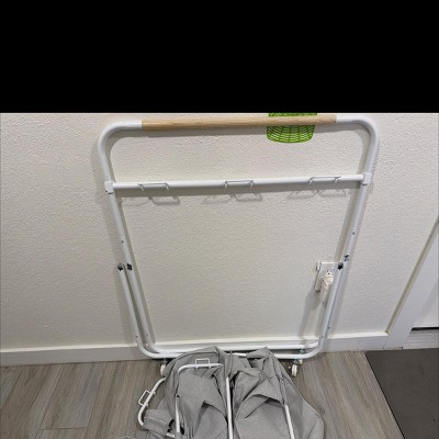 We bought this for our baby’s nursery. It was super easy to put together and I really like that it has wheels. It’s lightweight and fits in our closet.