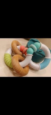 We love this teether! I like that it is made with silicone and beechwood, it's very natural and makes it feel safe for our baby. One of the unique things about this tea there is that it is twistable and movable for Arabic and movable for our baby to experiment with movement. 50 there not only does its functional job with the T but also profile provide cool textures and sound. We would recommend this to anyone I received this in exchange for my honest review.