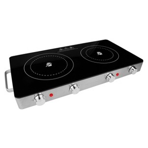 The Brentwood Select 1800 Watt Double Infrared Electric Countertop Burner in Stainless Steel with Timer rapidly and healthily cooks food with any type of cookware. Food stays juicy and holds more nutrients thanks to faster and hotter infrared heating. Has 5 inch 800w and 6 inch 1000w electric burners, adjustable heat, 60min timers with auto shut off, power and heat indicator lights, and durable stainless steel housing. Easy to clean ceramic glass surface. Beautiful stainless steel and black double burner looks great on every counter top.