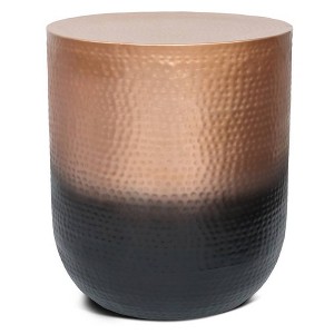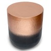 Add warmth and dimension to your space with the Kacy 19-inch Metal Side Table in Copper Ombre from the WyndenHall Collection. This bold, sculptural side table is handcrafted from durable hand-hammered iron, with a stunning ombre finish that fades from luminous copper to deep black. Its compact, round design makes it an ideal accent next to a sofa, reading chair, or bedside, offering just the right amount of surface space for a drink, book, or small lamp. A clear powder-coated finish enhances the texture and protects the color from everyday wear, while integrated floor protectors ensure it stays gentle on hardwood and tile. With no assembly required and eco-conscious packaging, this statement side table arrives ready to impress.