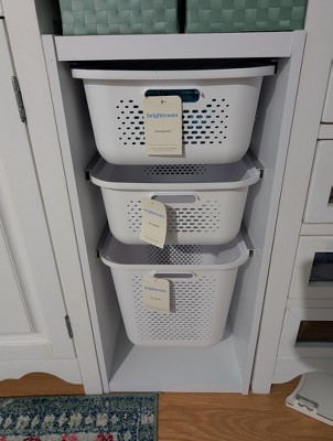 I have now purchased 3 of these short sliding bin cubes, as well as the tall sliding bin cube/ tower. They are extremely versatile and can be used in any room. I use the 3 short ones in my closet, replacing the need for a dresser, along with the sliding baskets for all of my ‘folded clothes.’ The Tall Sliding Bin/ Tower is in our ‘play area’ and is perfect for organizing toys, arts + crafts, play food and dishes, and so much more. I use 2 large sliding baskets with lids, and 2 small (I think they're the small ones) sliding baskets with lids. Each cube/ tower includes all necessary hardware, easy-to-follow assembly directions, and the option to anchor your bin/ cube/ tower to the wall (you'll want to use the anchor in a playroom). After at least 4 weeks of research and searching storage options, the Brightroom line sold at Target was the clear winner. If they're still available I plan on buying 3 more🤞