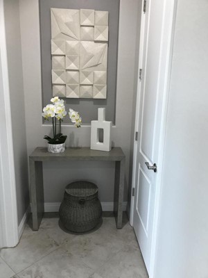 Beautiful simple contemporary table. Love the neutral color. Perfect fit for this spot I had to decorate.
