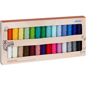 Mettler-Metrosene Gift Pack Article 9161. An all-purpose polyester thread that is machine washable, dry clean-resistant, press-resistant to 392 degrees, color and lightfast, sew-resistant, rub-fast and shrink-free. This package contains twenty-eight 164 yard spools of polyester thread in assorted colors. Imported.