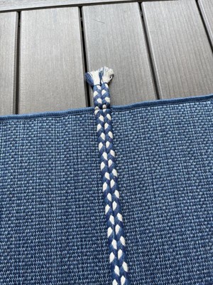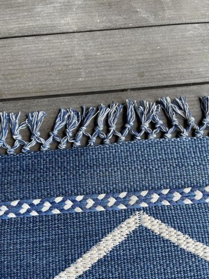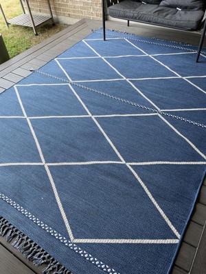 This outdoor rug is the perfect addition to any patio/deck. The color is very vibrant being dark blue. It has a diamond pattern with a braided line at each end and in the middle with each having an extra couple inches off the rug like a tassel. There are also tassels on either end.