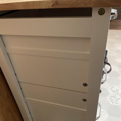 Just a couple more tweaks would have made this perfect. The cam locks are completely exposed. They should have been inside the drawers or at the very least have caps that covered the exposed hardware. It's not very sturdy. I won't be able to use it as a an extra prep surface which is what we bought it for. The "removable" tray is held in place by two dowels. I was hoping to be able to slide it in and out. There are no tracks so it doesn't stay on the two pieces of wood it sits on if you slide it. The top is bowed so you can't use it as a flat surface. (I placed cutting board on it for the picture.)
