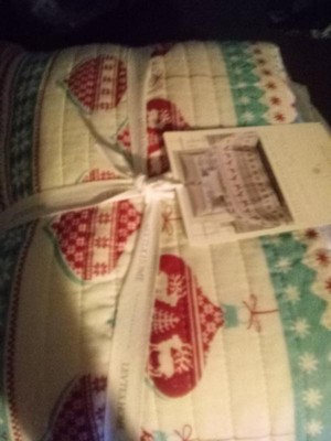 [This review was collected as part of a promotion.] I am in love with this beautiful design for Christmas. Its not too much, its a beautiful quiet pattern. The quilt is sewn very well and shows the quilted sewing. It is light weight, which will be perfect for this winter and easy to make your bed. It fits my bed very well. I love the pillow covers, they to be tied to fit your size pillow. The combination of colors and being reversible makes this a perfect quilt set.