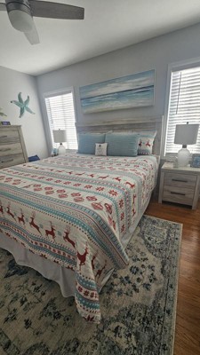 The Silent Night Reversible Quilt Set by Levtex Home is inspired by cozy fair isle sweater knits. Offered in teal, red and white, this design will immediately transform your bedroom. Made with the softest pre-washed cotton, this reversible quilt features a print of deer, ornaments and snowflakes in rows, reversing to snowflake medallion on the other. The Quilt Set is machine washable and includes the quilt and pillow shams. Bring the holidays home!