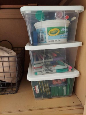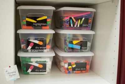 [This review was collected as part of a promotion.] I used these to organize my kid's crafts. They were the perfect size for glue sticks, markers and etc. The bins are clear so my kids can see which tote they need to take out of the cabinet. The lids do snap in place so all the items are secure.