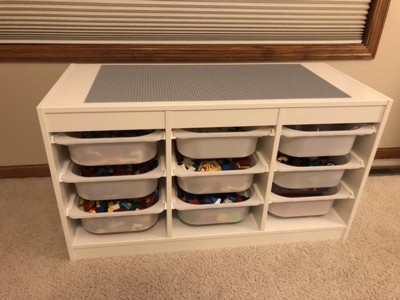 I made a lego table for my son with 4 of these and (2) 2 cube organizers by brightroom, also target. These baseplates say just over 13" square. So there was a bit of overhang on the edges of the cube organizer. But a quick YouTube video showed me how to easily cut the baseplate straight. I am however irritated I could not find the exact measurements for the baseplates.