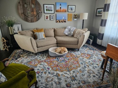 I needed a rug that was subtle but still had some pops of color. Also needed the right price since my dog was going to be on it the most. I had ordered 2 rugs before this one, both $100 more and this one was the winner! It came folded which seems to be the new way of shipping rugs, not a fan of that (4 stars) but we looked up some tips & tricks and got the folds to relax. Ice cubes work well on the corners and a steam iron with a towel works well with the creases. Great colors without being overbearing, exactly what I was looking for, for a great price. Dog approves.