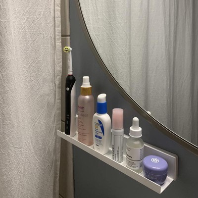 I am not sure if I am going to keep this (or keep it here) since it ended up not being quite the right depth for what I had envisioned it holding. About a dozen nails to pry out and holes to spackle over if I remove (can I return without nails or potentially unusable nails…?). Generally easy, intuitive installation. Wasn’t evident if plastic back was strictly directing nails in a particular angle. Very lightweight material—if I reinstall it elsewhere I might try 3M strips. I thought the materials were great for a humid location. I was searching for a ledge for above a pedestal sink that doesn’t have much counter space. Photos of what didn’t fit and what did. It still gets a recommendation and four stars because it’s my own fault for estimating measurements.