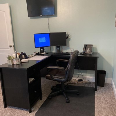 A home desk is used for more than just work from home activities—making grocery lists, art projects, and more all happen at a home desk. Do all these undertakings and more, with the stylish and functional L-shaped desk from the County Line® collection. A spacious top surface accommodates a computer, binders, and photos of your loved ones—this home office desk has room for it all! This L-shaped computer desk includes a file drawer with full extension slides that holds letter-size hanging files to keep your documents organized. To store your pens, stapler and notecards, this desk with file drawer includes a smaller drawer with metal runners and safety stops. An open shelf for additional storage allows you to display items like books, home décor, or other trinkets. This small office desk is finished on all sides so it will look polished no matter how you arrange it in your home. A cord management system with two desktop grommets keeps your workspace free of cord clutter. Finally, a quick and easy assembly process aided by patented T-slot drawer system and patented slide-on molding allows you to assemble your new L-shaped desk in a breeze. Finished in Estate Black ®, this L-shaped home office desk adds the right amount of space and style to any home office.