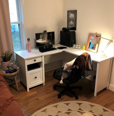 I wanted a new L shaped desk for my home office but it would only be against the wall on one side so I wanted the back of it to be nicer looking and not see all the cords. This desk definitely has the look and feel of a piece of furniture for a great price. It did come with some damage that appeared to have happened before packaging because all the packaging was in fine order. I was able to call Sauder directly and their customer care was happy to replace my damaged piece (awaiting it's arrival now). The drawers feel very sturdy, I love the cubby storage between the two drawers. There are nice features like trim pieces under the countertop and cutouts with caps for your cords to go through on both countertop pieces (although I wish they were white as the black caps really stand out). Overall, I'm very pleased!