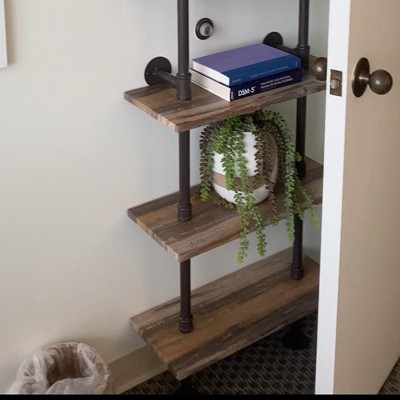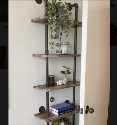I love this bookshelf so much! The height is great on it, I love that it goes almost up to the ceiling. I like the color wood on it, sort of a medium natural color. And I enjoyed that it sort of has built in book ends if you put books all the way filling up the shelf from left to right, because the industrial poles on both sides are in the middle of each wood piece. The assembly took my dad who is good with drills but with putting the industrial pole end standing on the ground, it really just takes looking for studs if you can and drilling straight where you need to. It Does take While to twist all the wood and industrial pile pieces together, before putting it up on the wall, but I found it very worth the outcome. I want to buy another one so I hope they go back in stock!! Annoyingly I couldn’t fit the whole photo in the square photo upload option, so the photo is cut in half vertically.