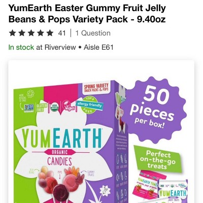 Yum Earth candy offers a “less junky” candy choice for families like ours which I appreciate but this box is not 50 pieces as advertised. The Target app lists 50 pieces but the box I received says it contains only 20 (see pic). I lucked out I guess as mine had 30 (10 lollipops, 5 jelly beans and 5 fruit snacks). The lollipops won’t fit in a plastic egg so I just spent $10 to fill 10 eggs. That’s absurd!