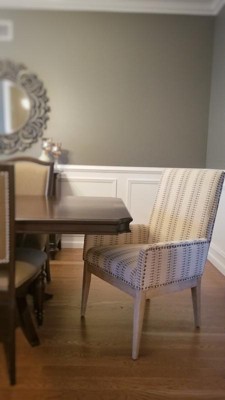 [This review was collected as part of a promotion.] I had the opportunity to feature a set of 2 Madison Park Rika Arm Dining Chairs in my newly renovated dining room. This pair of arm chairs chairs combines farmhouse style and sophistication. Some light assembly is required of the chair legs; although all tools and components are included within the package. Assembly of the pair took less than 15 minutes when completed by a single person. The Rika Arm Dining Chairs are upholstered in a neutral, tan linen fabric, and feature a simple geometric pattern in a darker shade of brown/bronze. The chair frame/legs are made of beautiful wheat wood, making this product easy to match with most any room decor. A bronze nail head trim adds elegance to this duo. I chose to place these upholstered pieces at the host ends of my dining table, amongst my existing dining chairs. I absolutely love how these exquisite dining chairs coordinate with my existing decor and break up the monotonous tone of my dining area. Overall, Madison Park Rika Arm Dining Chairs are high quality in comfort, design and feel. I have recieved several compliments from friends and family on the appeal and comfort of these arm chairs. I highly recommend this product to anyone wanting to add charm to or achieve a designer look in a dining area, kitchen or even a small entryway/nook.