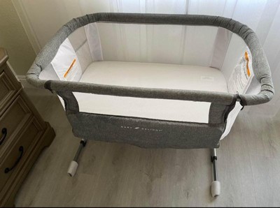 [This review was collected as part of a promotion.] This is such a lovely bassinet. The design of it goes perfect in our bedroom as well as the gray color is really attractive. Having storage area off to the side is ideal because can place wipes and diapers whatever else may need at an arms reach . It's very sturdy but easy to move and set up in another room . The bed itself is firm but still soft . Very happy with this bassinet.