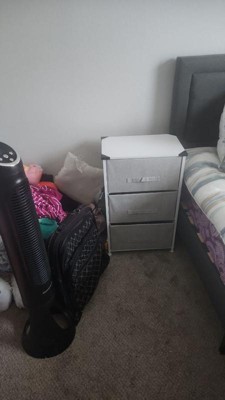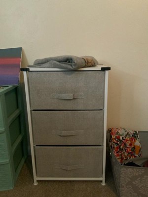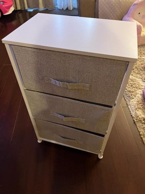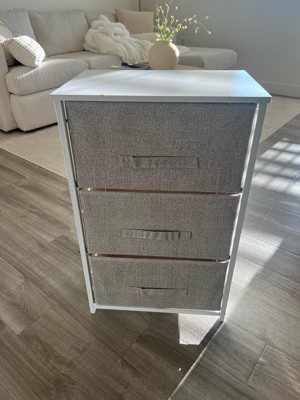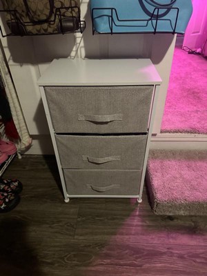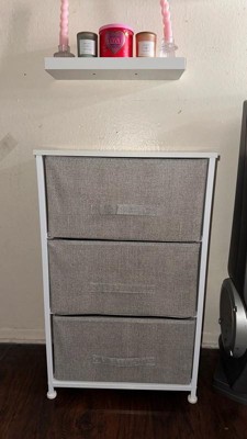 Get much needed storage at an economical price that works anywhere in your living space with this 3 drawer vertical organizer. Whether you need a place for current or out of season clothing, washcloths, or charging cords and remote controls, the three easy pull fabric drawers are a perfect solution. Use this vertical storage tower as a nightstand to hold your cell phone, glasses, or nighttime glass of water. Storage doesn't have to be bulky to be strong. Metal screw construction securely joins the powder coated cast iron frame of this fabric dresser together. The durable MDF wood top provides a hard surface to set books, lamps, or a vase of fresh flowers and holds up to 40 lbs. static weight capacity. Polypropylene fiber drawers not only look great but are fade and stain resistant to help this dresser with drawers retain its great looks. Quick and easy assembly can be achieved in 10 minutes or less with the step-by-step illustrated instructions or online PDF. Plastic adjustable floor glides protect your hard flooring surfaces and provide a stable platform on uneven flooring surfaces. Quickly remove spills with a clean damp cloth. Use this vertical dresser in or out of your closet for extra organization that goes above and beyond plain plastic bins. Additional Features: Rust Resistant White Cast Iron Frame with Long-Lasting Metal Screw Construction, Adjustable Plastic Floor Glides provide a stable, level surface and protect hard flooring surfaces, Easily Cleans with Damp Cloth to retain its great looks, Assembles in Under 10 Minutes with illustrated instructions or online PDF, Stable storage solution for any room, mix and match from our entire collection
