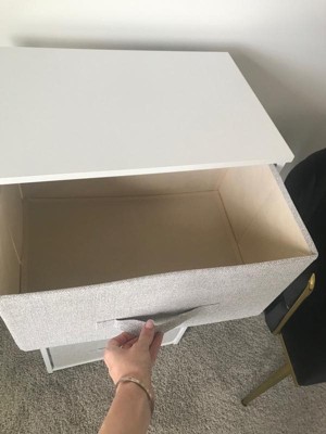 This is a wonderful little dresser I got for our guest room. It arrived quickly and was very easy to put together. It came with all the tools necessary. It took roughly 15 minutes to assemble. It was the perfect size for us. I'm enclosing a photo of the fabric drawer size and a close up of the fabric so that others can see. It has a bit of a texture to it which is really attractive. Very happy with this purchase!