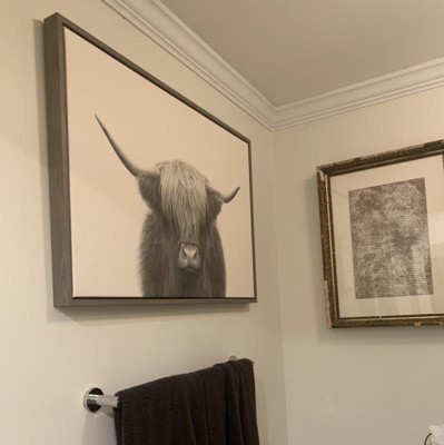 Such a cute picture! I was looking for a good size picture for my room to put on the wall behind my tv. As soon as I saw the Highland Cow, I knew this was it. It’s adorable. Love the gray frame surrounding the canvas print and the coloring of the picture itself. So cute and farmhousy which is what I love and was going for. Perfect size for the space it’s in.