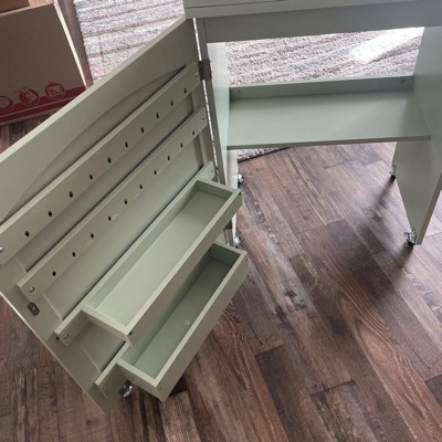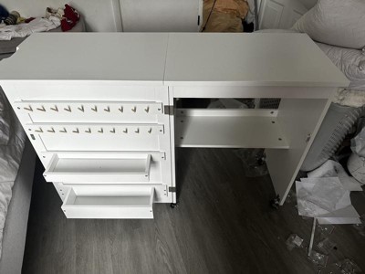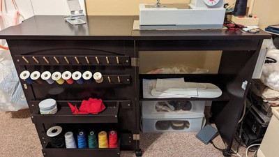 [This review was collected as part of a promotion.] This folding sewing table checked all the boxes. I don’t have a sewing room so this elegant piece of furniture is going to double as a nightstand. Easy, quick daily set up and good storage.