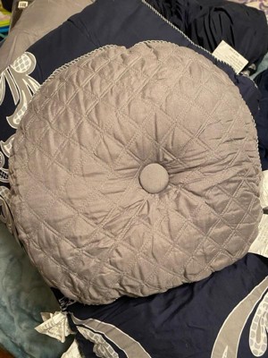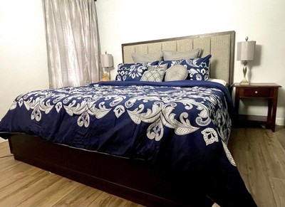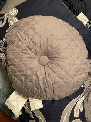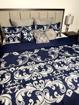This traditional scroll pattern is dominated by a navy blue background with the large scale repeating scroll pattern in silver and white shades on the face of the comforter. The ensemble is a ten piece set with bed skirt and decorative pillows and shams which completed the whole bed. Face fabrics are 100% microfiber polyester and filled items use 100% polyester fiber filling. The pillow shams use the print from the comforter face, while the European shams use a solid silver color. The decorative pillows use alternative prints that coordinate to the top of the bed with a quilted round pillow, embroidered breakfast pillow and two square pillows. Care and Cleaning: Machine Wash & Tumble Dry, Textile Material: 100% Polyester, Fill Material: 100% Polyester, Fabric Name: Woven, Piece 1: Comforter: 90 Inches (L) x 90 Inches (W), Quantity 1, Number of Pieces: 10, Thread Count: 180, Style: Comforter Bedding Sets, Fabric Weight Type: Year Round Fabric Construction, Backing Material: 100% Polyester, Closure Type: Not Applicable, Includes: 2 Euro Shams, Bed Skirt, Comforter, 2 Shams, 4 Decorative Pillows, Piece 2: Pillow Case: 20 Inches (L) x 26 Inches (W), Quantity 2