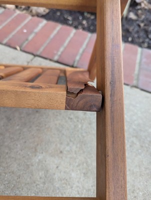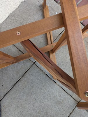 Table and chairs were easy to set up and look wonderful on my porch! Disappointed that the chair came broken. It looks like part of the problem may be the wood quality.