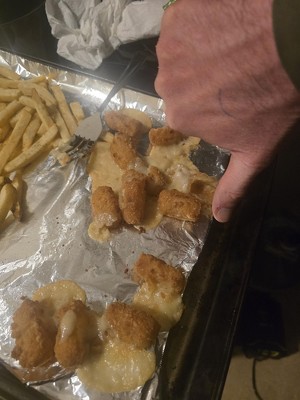 Basically, just deep fried breading remains after baking. The vegan cheese melts into runny liquid. Yuck. Waste of money. Vaguely stinky during baking.
