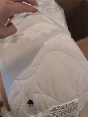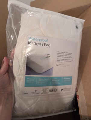 Enjoy a blissful night's sleep by placing this Waterproof Quilted Mattress Pad from Room Essentials™ on your bed. Suitable for mattresses up to 15in deep, the waterproof quilted pad has a four-way stretch skirt that allows it to nicely fit your mattress. The mattress pad features a quilted pattern with ultra-loft filling for luxurious comfort, while the waterproof construction provides protection against spills or accidents. Plus, the solid white color stays concealed under your fitted sheet, so you can layer it with any type of colored linens of your choice.