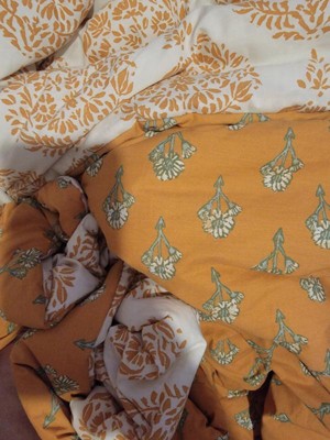 • A: The comforter features an allover floral print on a golden background, adding elegance.