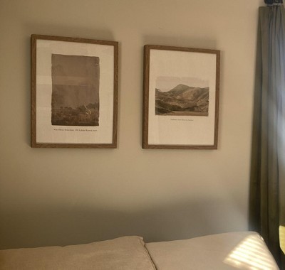 I was so excited to order these paintings when I found them. I was disappointed to see them in person as the wood frame is much more grey toned than I care for. The images are also a bit more muted and darker than expected. The photos online show a bit more vibrancy and contrast than the in person photos have. I will be returning.