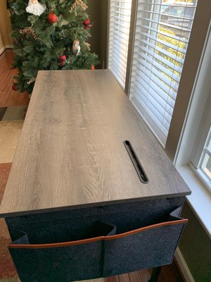 [This review was collected as part of a promotion.] This desk is perfect for my home office. Its just the right size for me. The pocket on the side is helpful to hold my paperwork and the divit for my phone and ipad is essential so it doesn't get lost on my desk! It came just as described and was easy to assemble. The color is gray and doesn't scratch. Highly recommend!