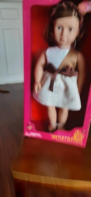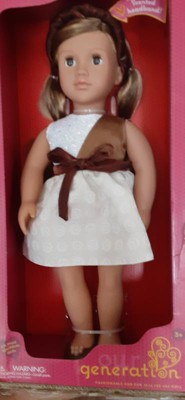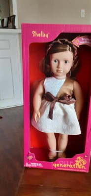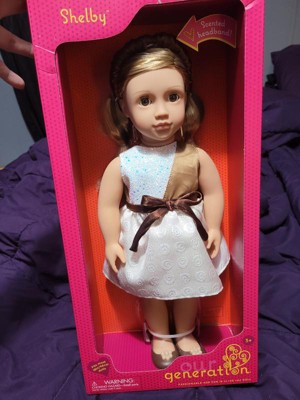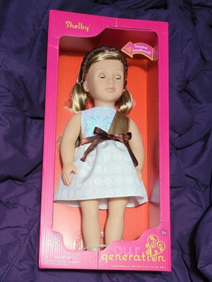 [This review was collected as part of a promotion.] My daughter has absolutely fell in love with this our generation doll! The dolls name is Shelby and it has brown hair and hazel eyes that open and close when you tilt the doll. It is 18 inches tall and includes the doll,dress,shoes and a headband for the doll that smells like chocolate. The reccomended age is 3+. Overall this is a great doll that is made of great quality material and I highly recommend it!!!
