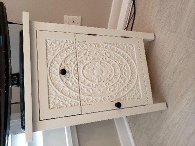 Embellish your space with the refined character of the Lambert end table. Made in China, this end table is constructed from sturdy wood. One drawer provides convenient storage for household essentials, while a large shelf behind the door supports larger items. The Lambert features intricate molding for a unique visual texture that exudes antique-like charm. Small metal knobs add a minimalist touch, making the Lambert end table a sophisticated solution to your household needs. Overall Dimensions: 25.59" High x 17.72" Wide x 13.39" Deep; Drawer Dimensions: 13.58" Wide x 12.00" Depth x 5.98" High; Storage Behind Door: 13.58" Wide x 12.40" Deep x 13.40" High; Legs: 3.35" High;