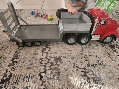 [This review was collected as part of a promotion.] I bought this jumbo carrier truck for my son recently. I have not heard a peep out of him since! This truck has kept him completely interested! He loves how the parts move and how he can put stuff in it. He loves how he can roll it in the grass dirt and rocks easily! This truck was made tough and my boy loves it! He is in love with the lights and sounds. Has everything a little boy wants from a toy . Definitely recommend this!