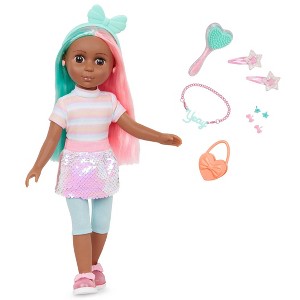 [This review was collected as part of a promotion.] My daughter is very into dolls right now and this one is a sure to be favorite. The dual toned hair and the sequined dress are her favorite part. She loves the little hair accessories that go with her. Most of her other doll clothes fit this one so it has become her new favorite to take everywhere.