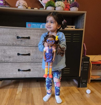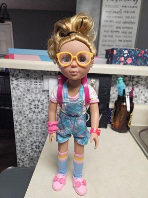 [This review was collected as part of a promotion.] 14-Inch Doll: Liddy is a stylish student with blond hair, green eyes, and freckles! Includes: A complete outfit and set of school accessories featuring a water bottle, notebook, stickers, pens, and magenta backpack that carries everything. Smart Style: Outfit features a starry t-shirt, colorful overalls, knee-high socks, pink shoes, yellow glasses, and a removable watch. Easy as ABC: Liddy’s clothes have easy-open closures for quick changes and more dress-up play. Mix & Match: Compatible with most 14-inch dolls, clothes, and accessories. Recommended Age: Suggested for kids ages 3+ (small parts).