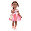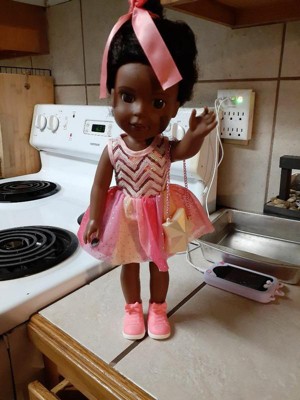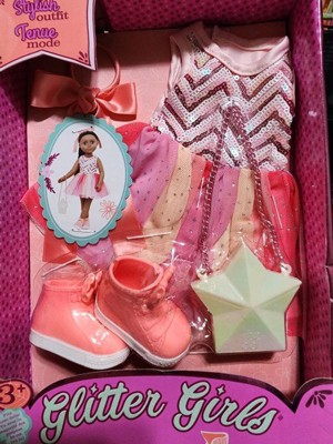 Twinkle and shine with the Glitter Girls’ Starlight Delight, the sparkling 4-piece outfit for 14-inch dolls! The sequined tutu dress features warm, pink, and peachy sunset hues that are sure to wow your friends. Put on the matching high-top shoes and check out their little bows! Need to carry your things? Swing the star-shaped purse over your doll’s shoulder for elegant and stellar style. This outfit also includes an elastic bow that you can use to tie your doll’s hair. Use it to make a chic ponytail, bun, or braid! Each item in this set is compatible with other Glitter Girls clothing and accessories, so you can mix and match to your heart’s content! Have fun swapping outfits with the easy-open closures in all Glitter Girls clothes.