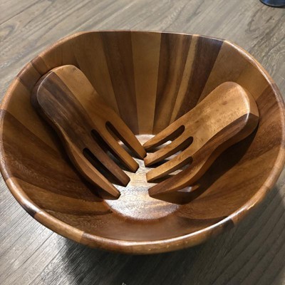 I was not expecting to find something of this look and quality from target. This can be a terrific gift. Great for housewarming. Perhaps for a newly married couple. I love the look of the dark wood. I also love that the bowl is not symmetrical. I wasn't expecting that the forks would have a prong sticking out of them that helps them hook onto the side of the bowl. That's a feature that I have not seen before. I received an incentive to write this review.