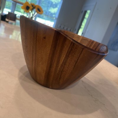 This bowl is beautiful! The wood looks and feels like it is made of high quality. I love the organic curvature of the bowl and how deep it is. This is very versatile and would be great as a centerpiece. I used it for movie night popcorn and it worked great. The salad tongs that came with the bowl are stunning too! This bowl would be an excellent housewarming gift or wedding gift. I received an incentive to write this review.